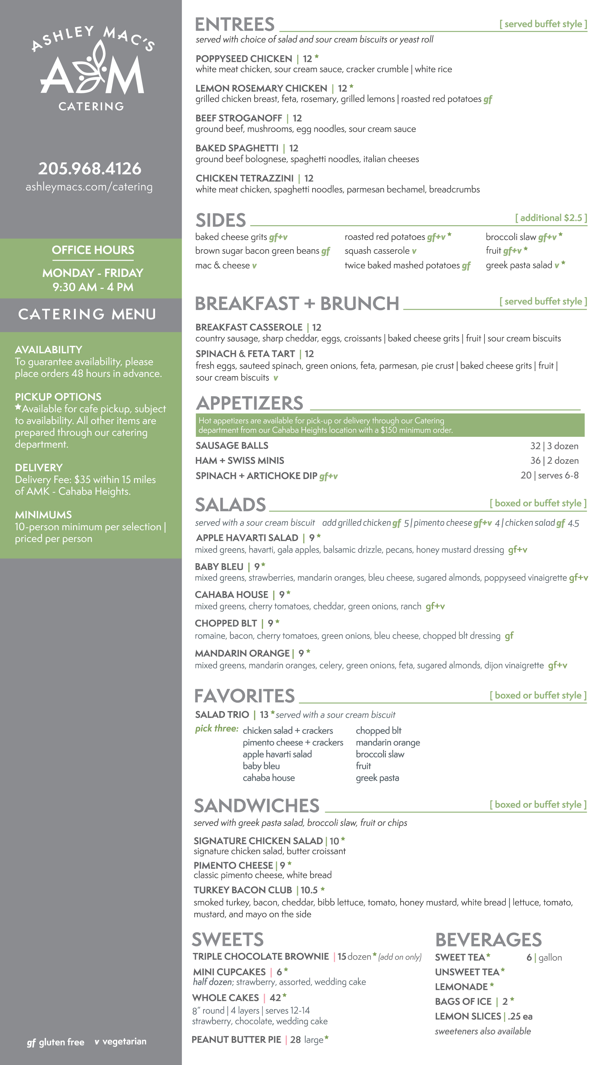 Focus on your event without having to worry about the food! In addition to our restaurant and market locations, Ashley Mac’s Kitchen offers catering! We offer delivery within 15 miles of our Cahaba Heights location, or pickup from our 4 main cafes, depending on your menu selection.