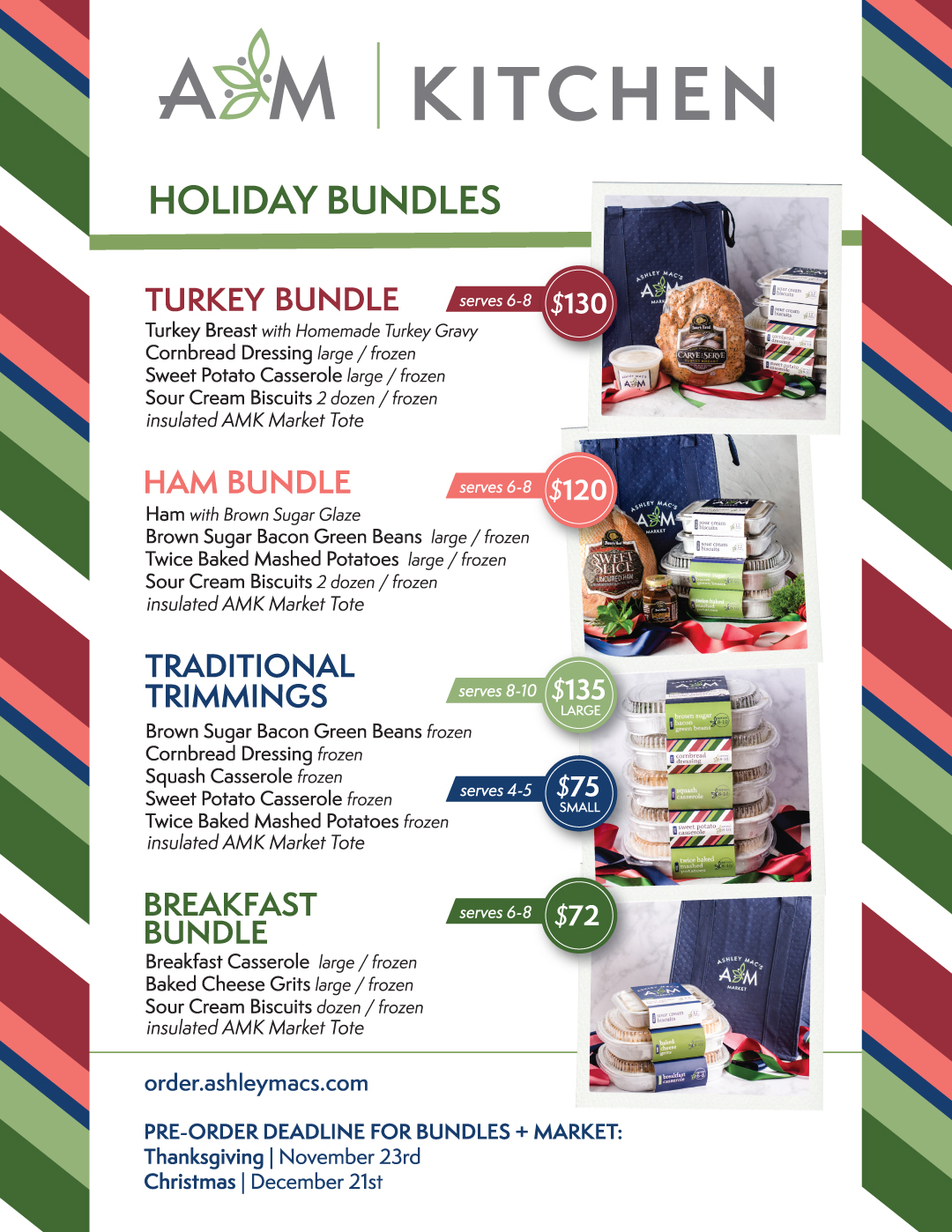 Don't miss out on your Ashley Mac's Kitchen holiday favorites! Place your Christmas pre-orders by December 21. This includes all bundles, sides, sweets, signature salads, and appetizers.